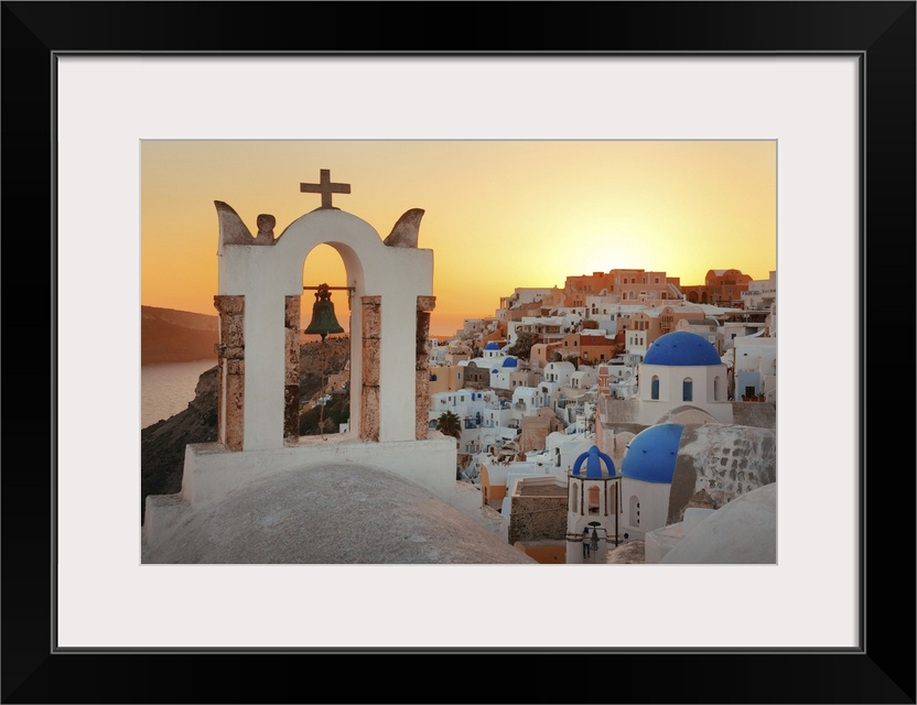 <p>Santorini Skyline Sunset With Church Bell And Buildings In Greece</p>