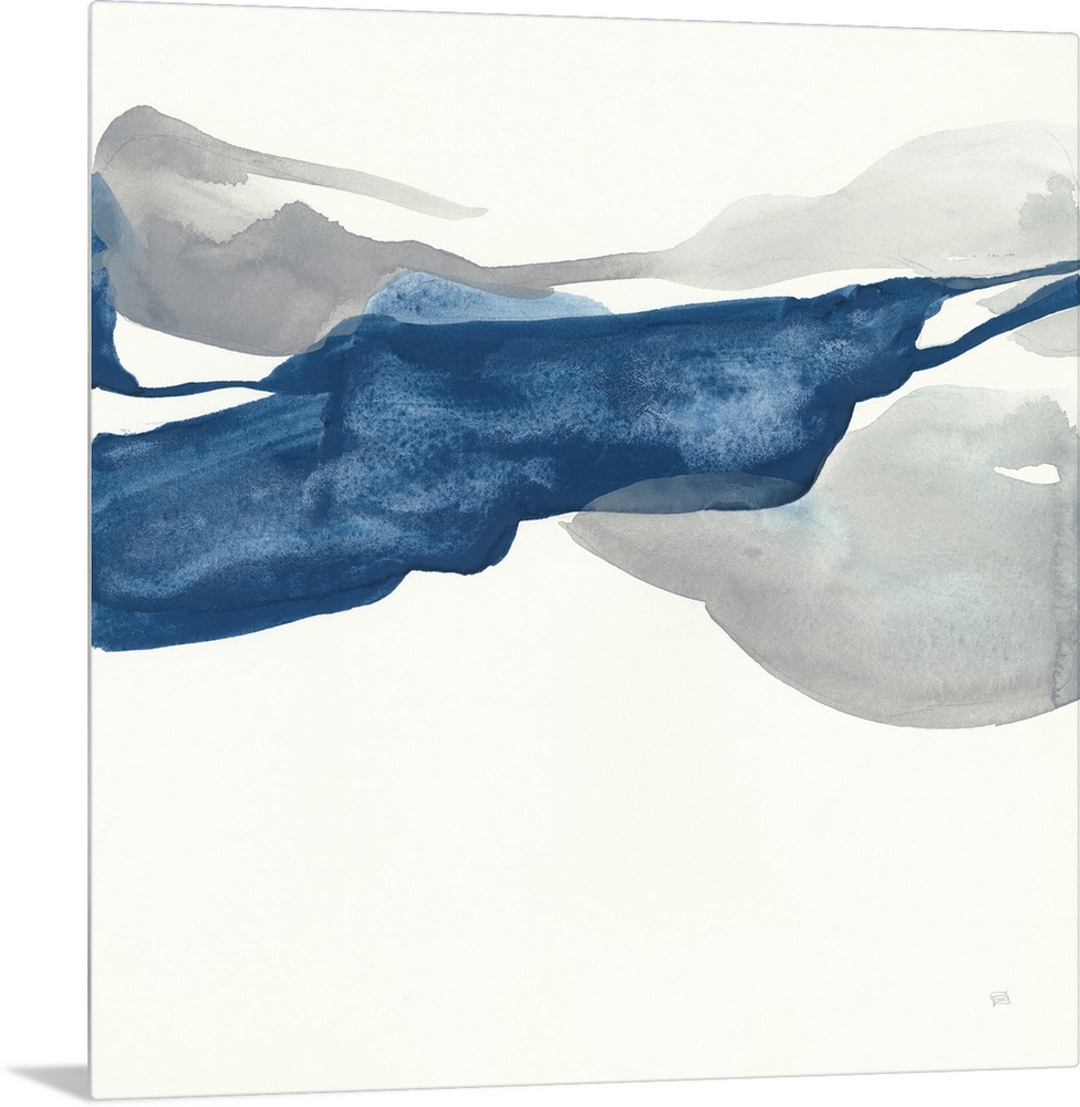 <p>A square abstract painting in textured tones of blue and grey.</p>