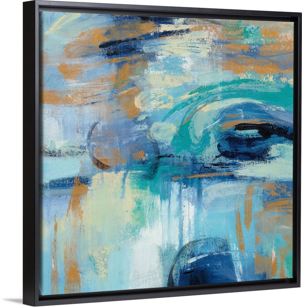 <p>Square abstract painting if varies shades of blue with orange accents.</p>