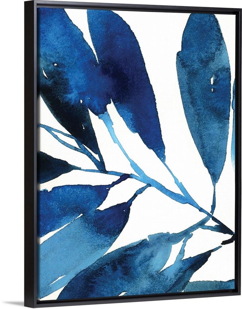 <p>Watercolor painting in shades of deep blue of several leaves on white.</p>