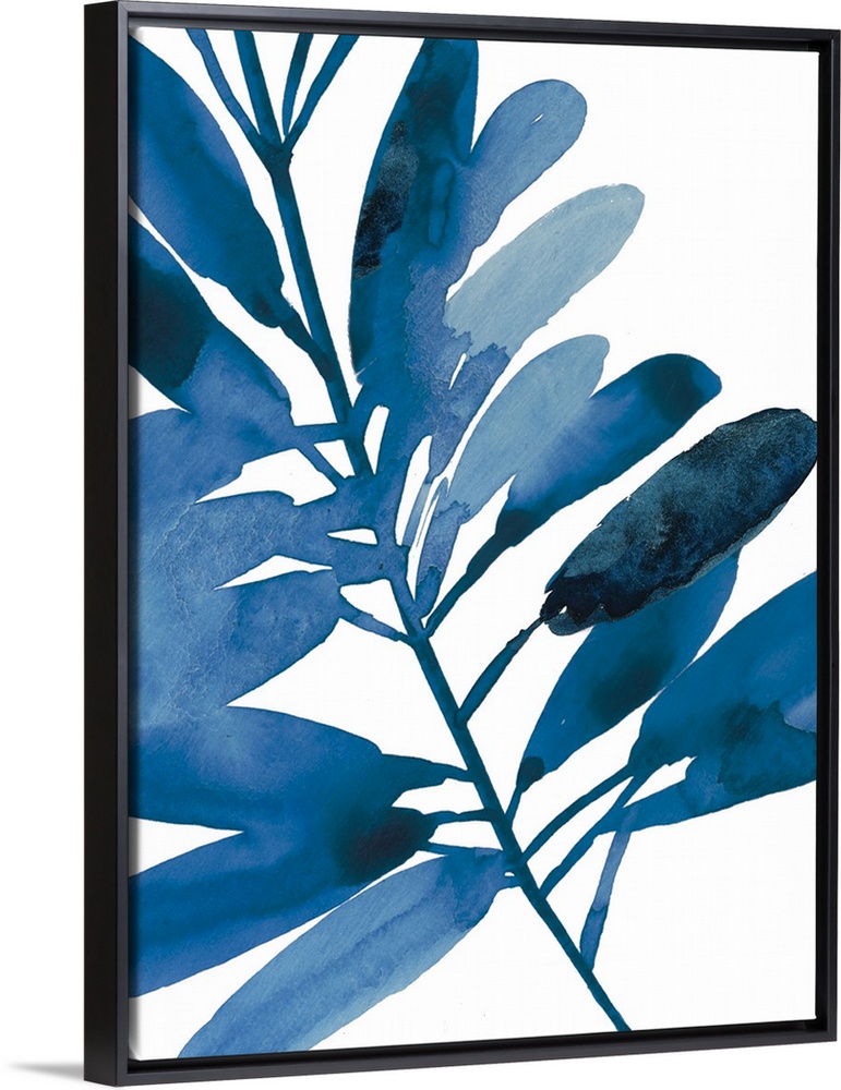 <p>Watercolor painting in shades of deep blue of several leaves on white.</p>