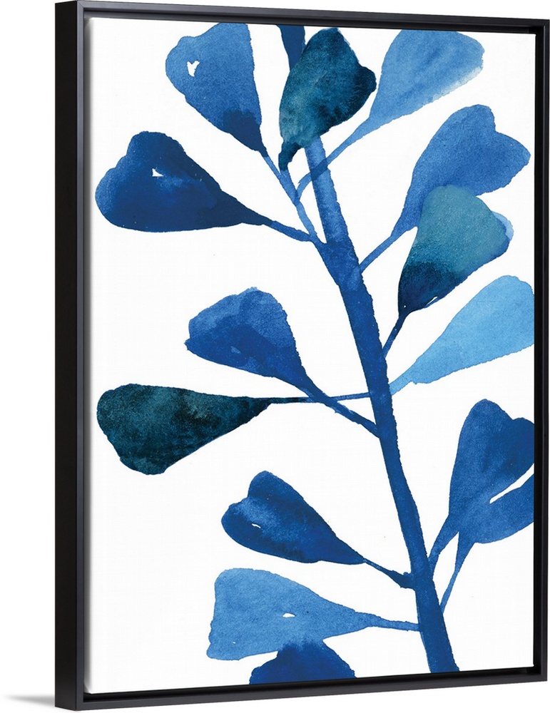 <p>Watercolor painting in shades of deep blue of several leaves on white.</p>