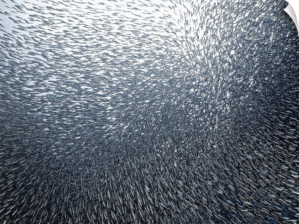 <p>Underwater photo of a school of tiny silver sardines swimming closely together, resembling an exploding firework.</p>
