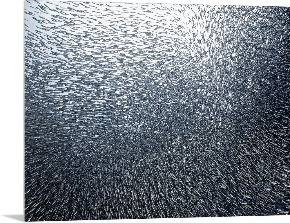 <p>Underwater photo of a school of tiny silver sardines swimming closely together, resembling an exploding firework.</p>