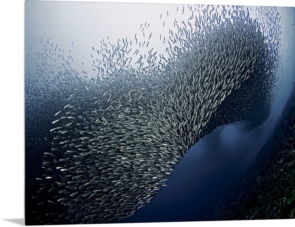 <p>A dynamic photograph of a school of fish swarming.</p>