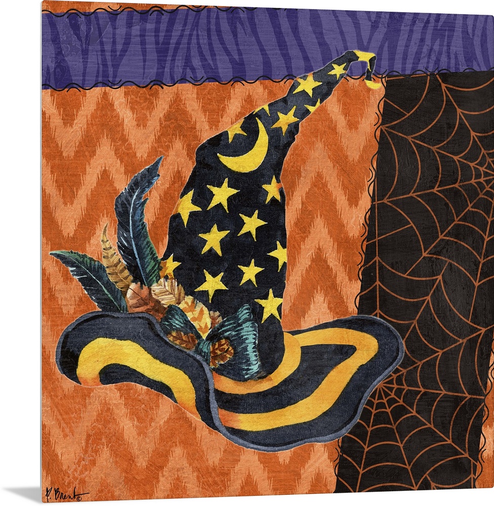 <p>Halloween themed artwork of a witch's pointy hat in festive purple and orange patterns.</p>