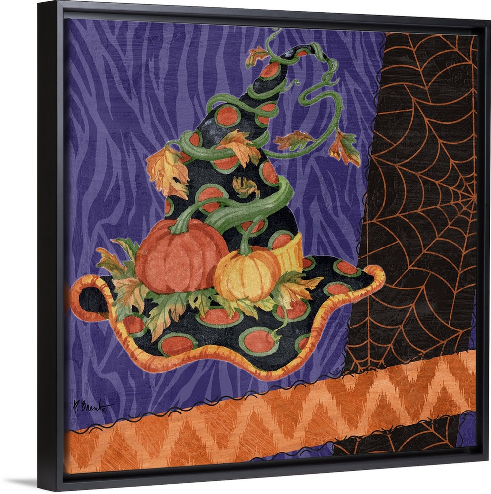 <p>Halloween themed artwork of a witch's pointy hat in festive purple and orange patterns.</p>