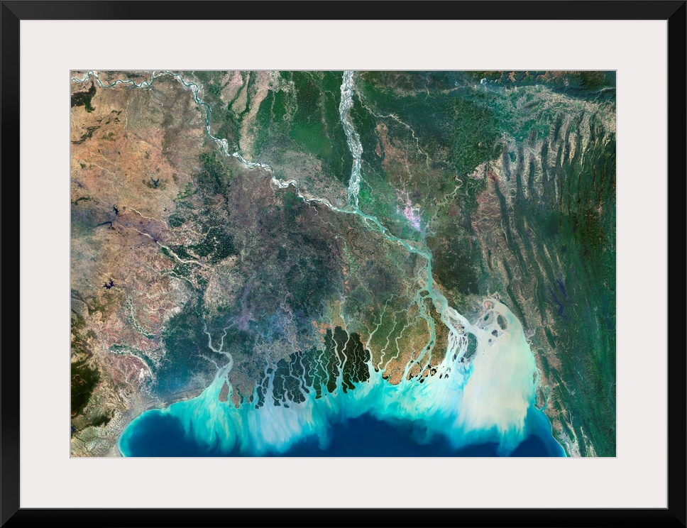<p>Satellite image of the Ganges River Delta, Bangladesh, India. Also known as the Brahmaputra Delta, it empties into the Bay of Bengal. Kolkata sits within the lower Ganges Delta along the Hooghly River (at west on the image). Image collected on March 16, 2.</p>