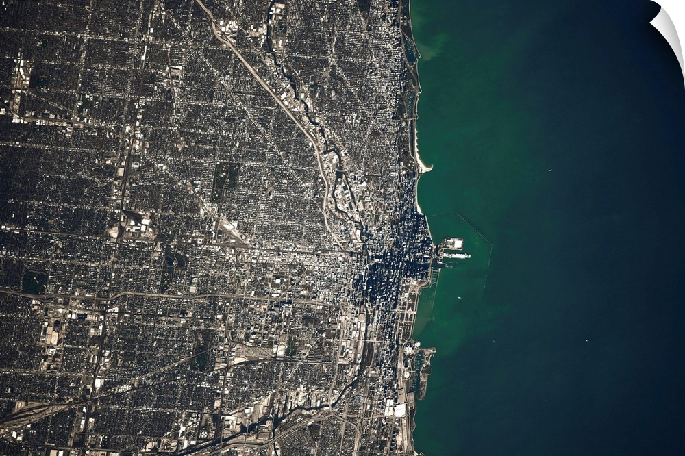 <p>Satellite view of Chicago and Lake Michigan, Illinois, USA</p>