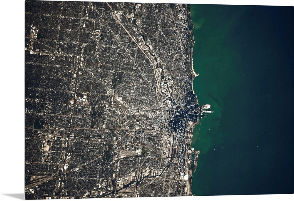 <p>Satellite view of Chicago and Lake Michigan, Illinois, USA</p>
