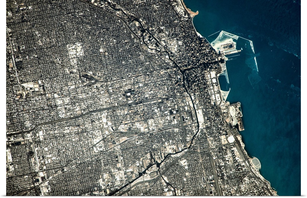 <p>Satellite view of Chicago city at the coast of Lake Michigan, USA</p>