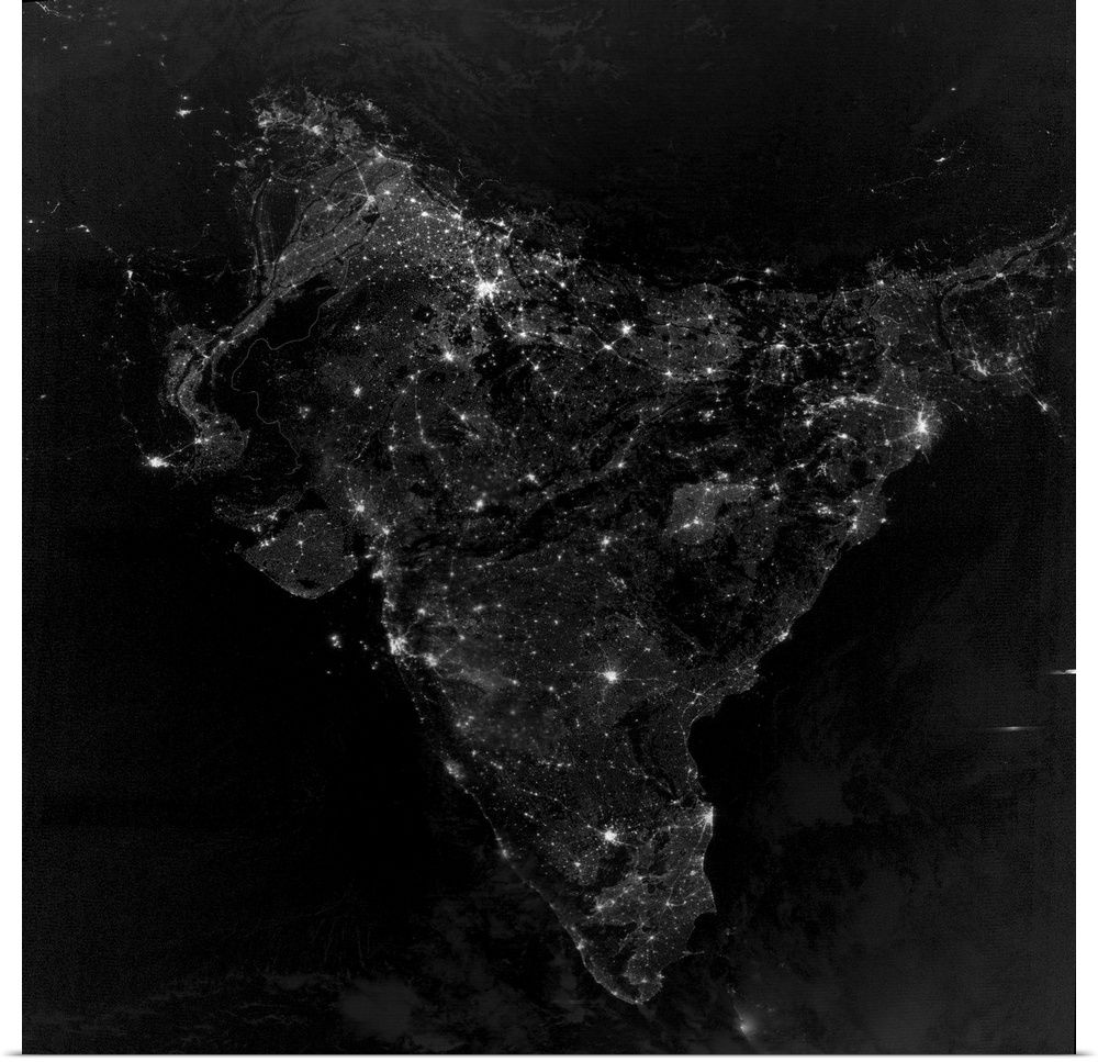 <p>November 12, 2012 - Satellite view of city, village, and highway lights in India.</p>