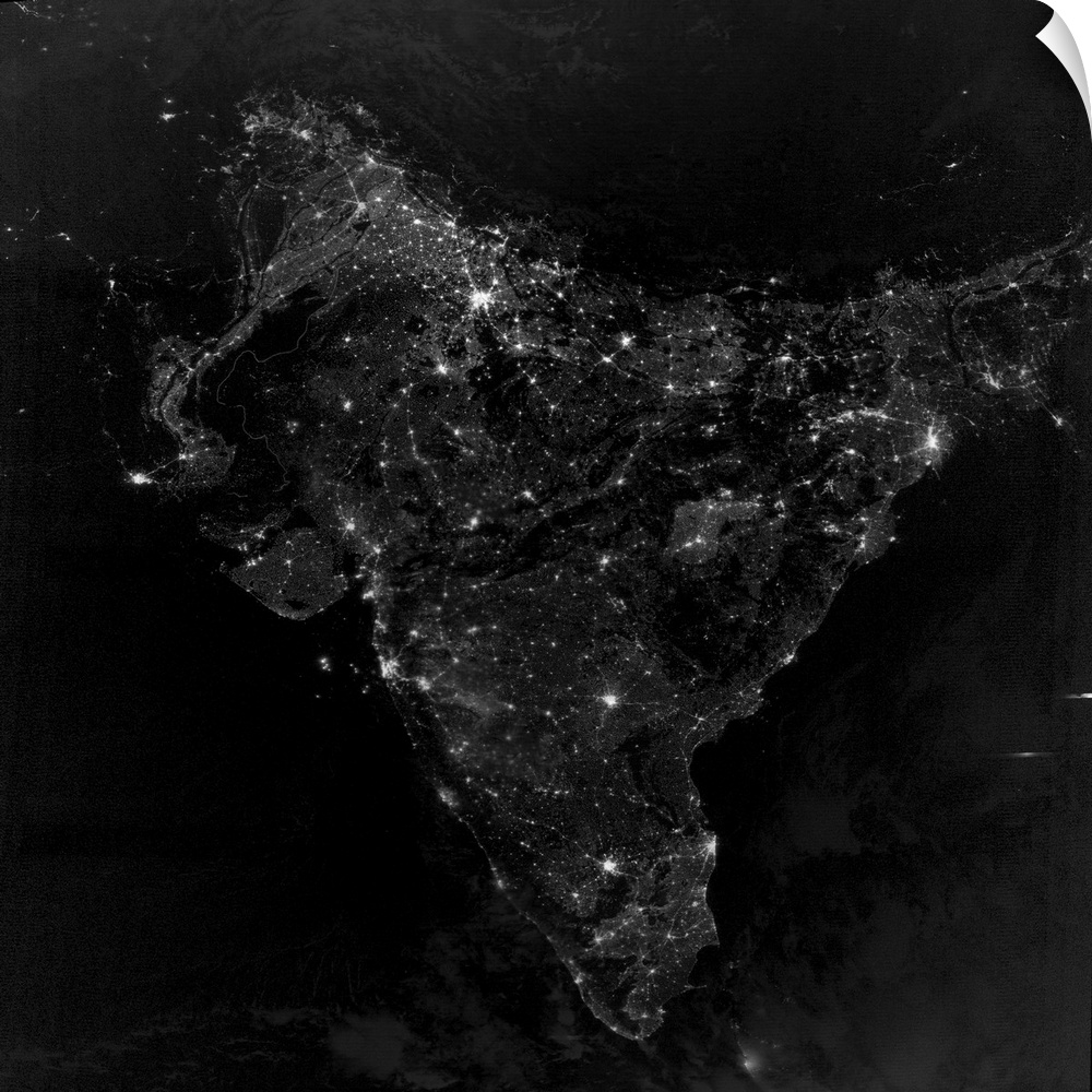<p>November 12, 2012 - Satellite view of city, village, and highway lights in India.</p>