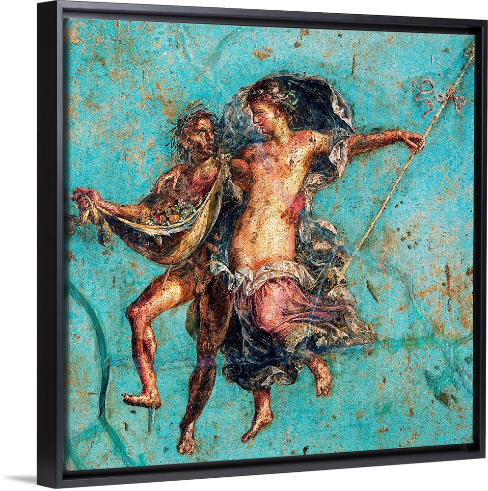 <p>Couple in Flight, by unknown artist, 62-79, 1st Century A.D., fresco, 45 x 45 cm - Italy, Campania, Naples, National Archaeological Museum, Room LXXII, inv. 9135. Whole artwork view. Satyr puts his arms around a maenad extemporizing a dance, with a mantle full of fruits in their hands, on a sky-blue coloured background; volumes and perspective are enhanced by lights and shadows; from Casa dei Dioscuri. - Naples, Italy - 2008/Luigi Spina/Electa/Mondadori PortfolioMondadori Portfolio courtesy of MiBAC/Authorization required for not editorial use. Please contact Mondadori Portfolio - 2008/Luigi Spina/Electa/Mondadori Portfolio/Everett Collection - (1873380)</p>