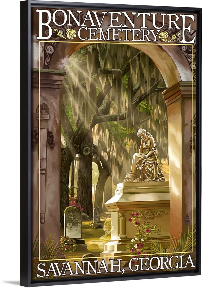 <p>Retro stylized art poster of a cemetery with a golden statue.</p>