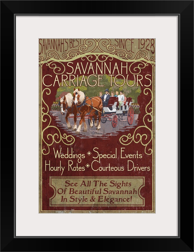 <p>Retro stylized art poster of vintage sign for carriage tours, with a horse drawn carriage.</p>