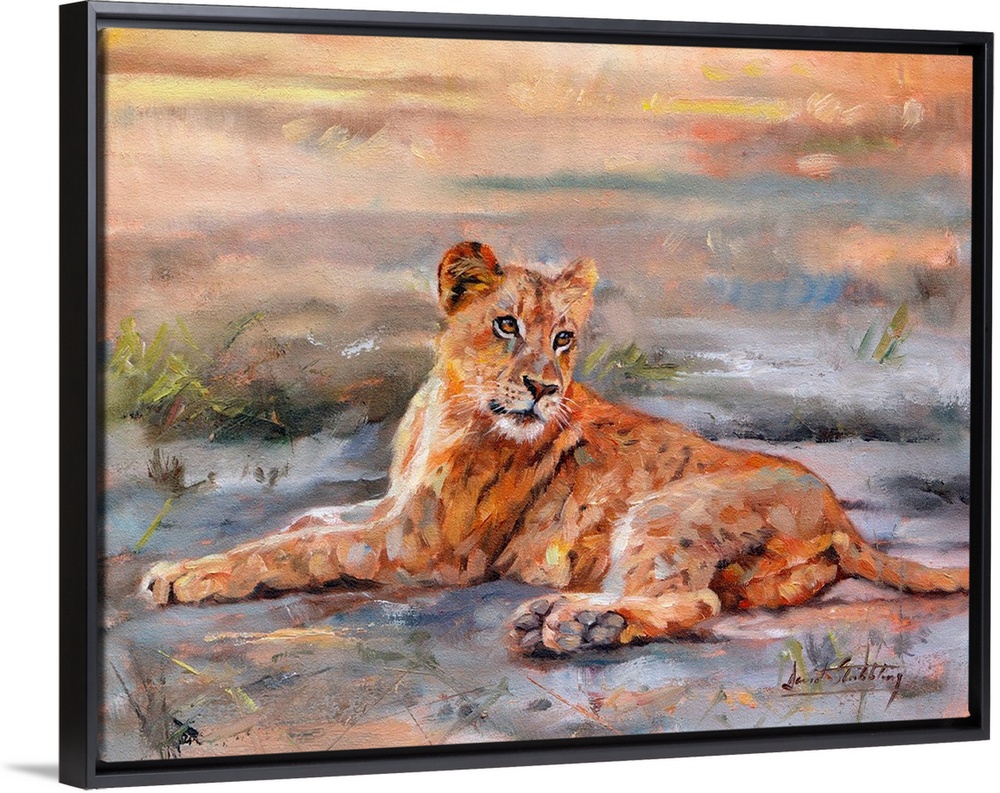 <p>Contemporary painting of a lioness laying on the ground.</p>