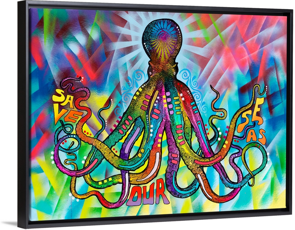 <p>Contemporary stencil painting of an octopus filled with various colors and patterns and text that says "Save Our Seas."</p>