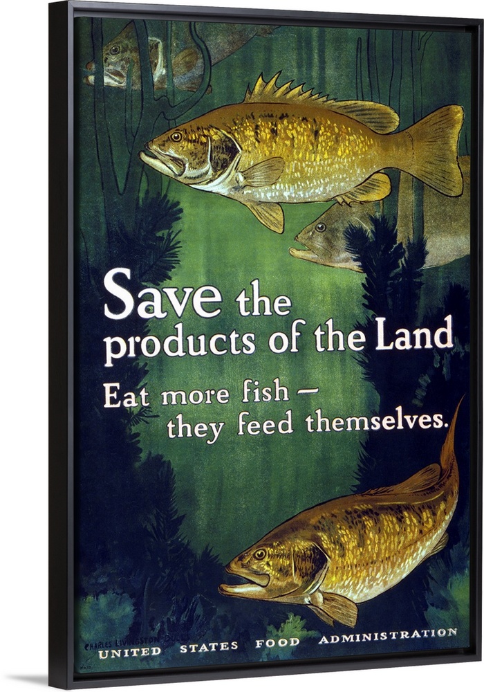 <p>'Save the products of the land - Eat more fish - They feed themselves.' Lithograph by Charles Livingston Bull, 1917.</p>