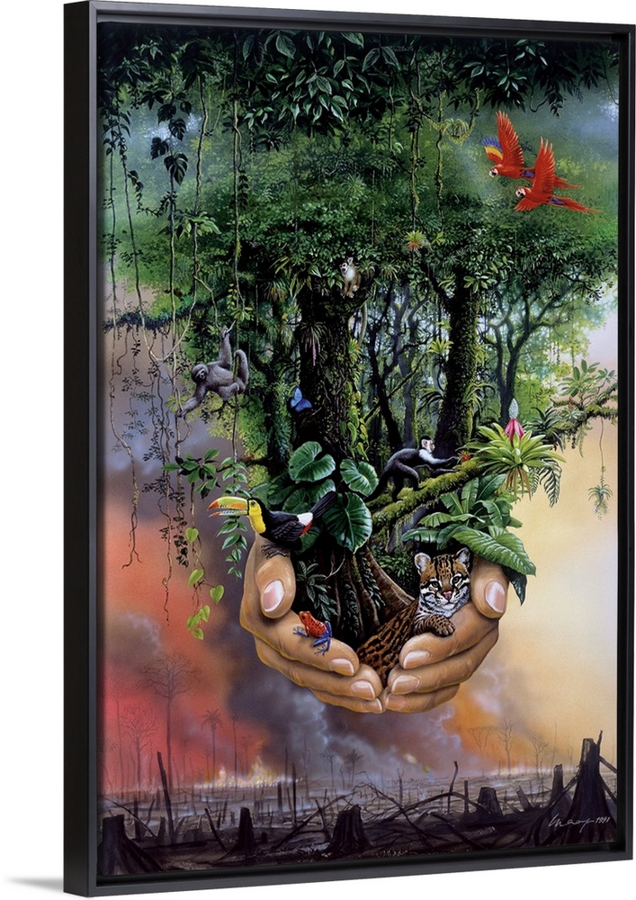 <p>Protective hands cradle the rain forest; beneath the hands there is a burned landscape, all that is left of a former rain forest.</p>