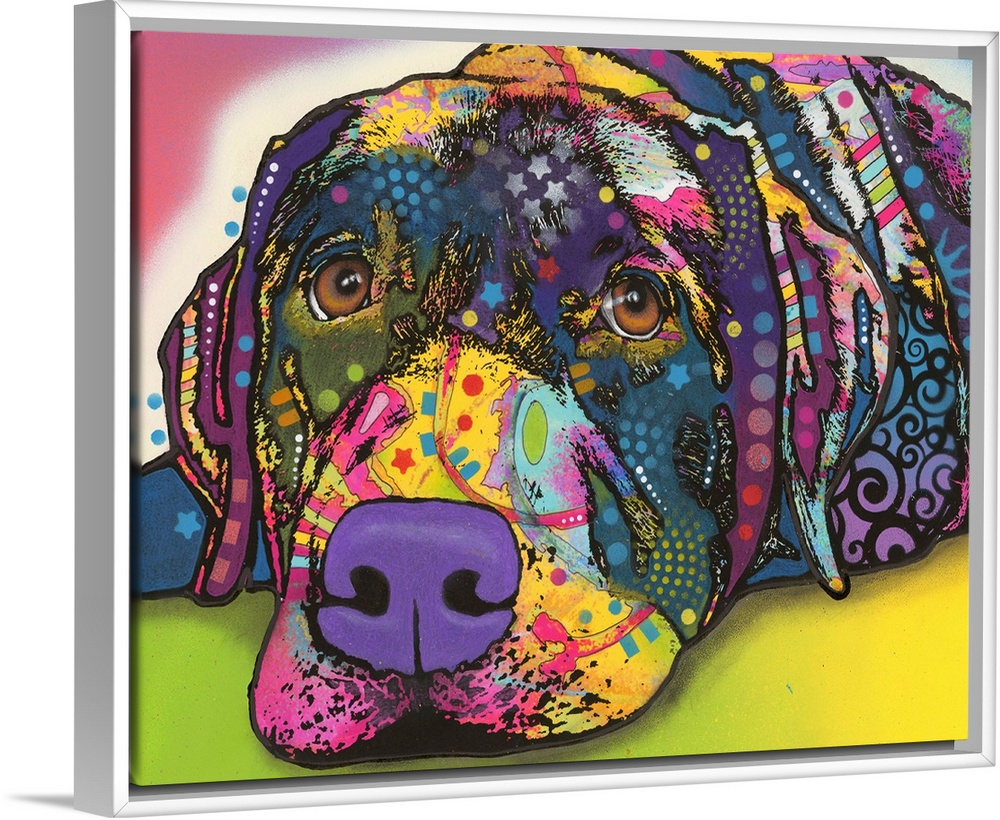 <p>Colorful painting of a Labrador with graffiti-like designs all over.</p>
