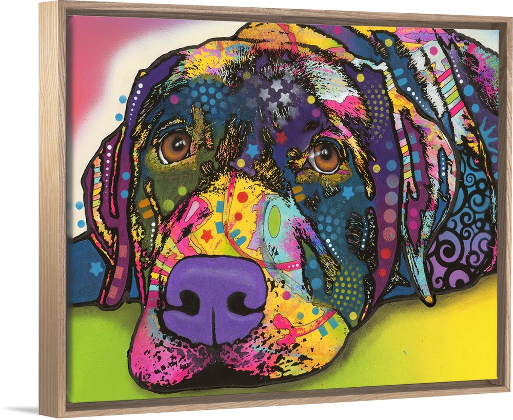 <p>Colorful painting of a Labrador with graffiti-like designs all over.</p>