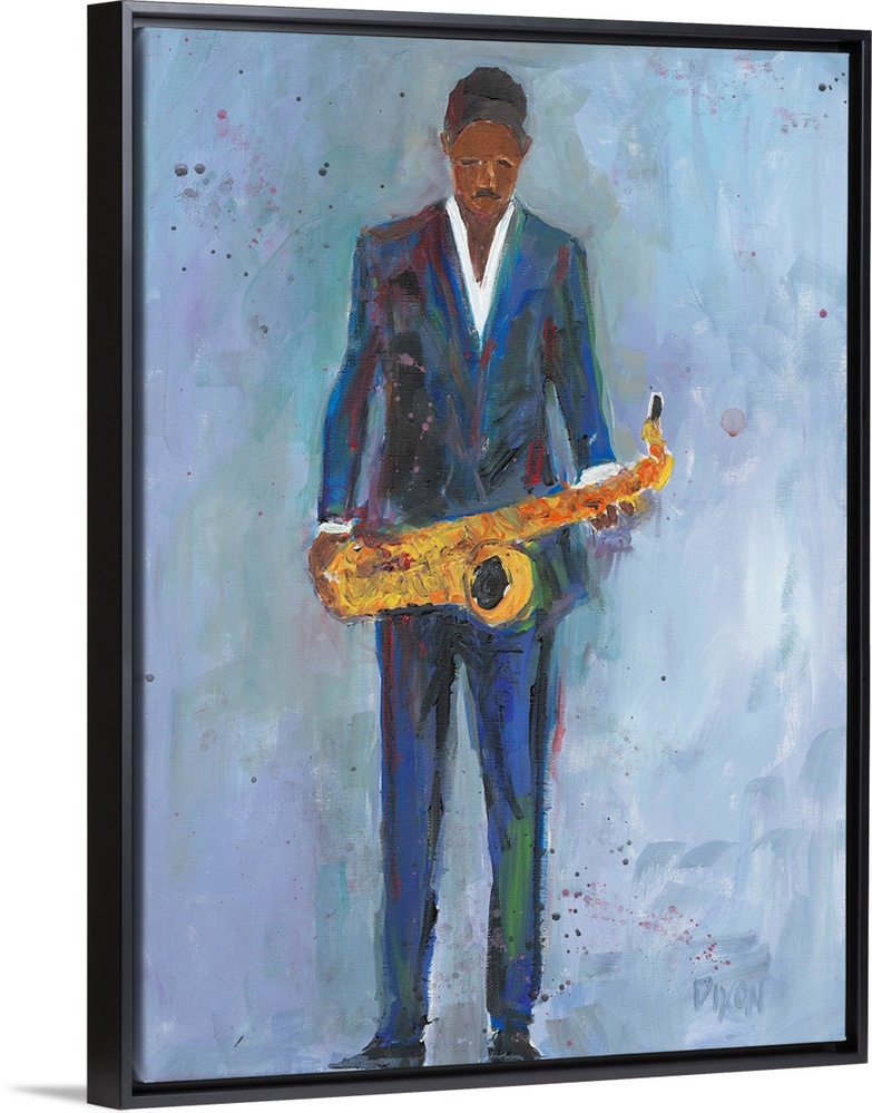 <p>Contemporary artwork of a man in a blue suit holding a saxophone.</p>