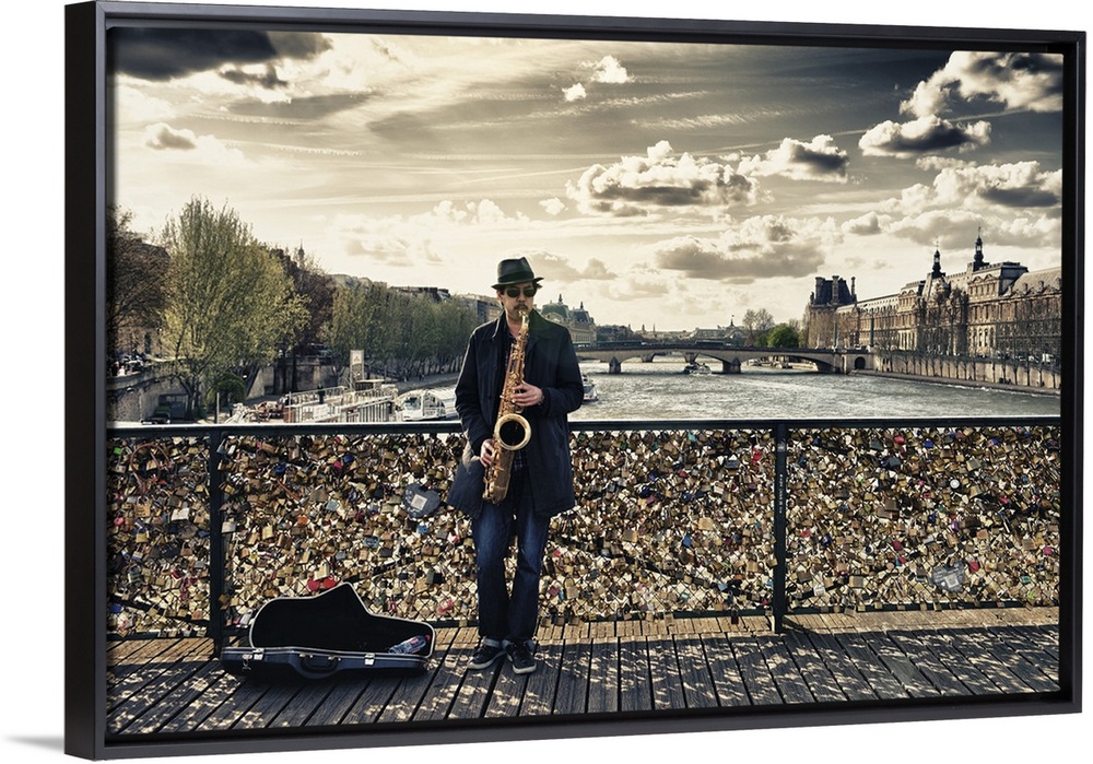 <p>Fine art photo of a man playing the saxophone on bridge covered in locks in Paris, France.</p>