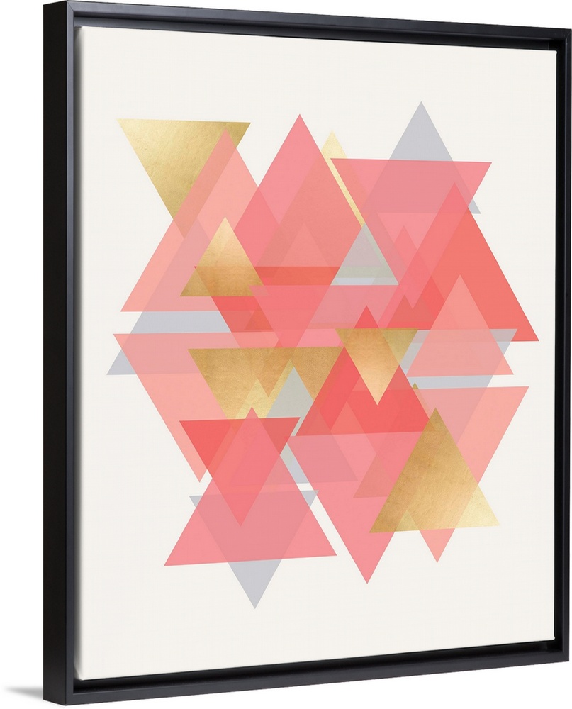 <p>A vertical geometric design of a group of overlapping triangles in pink and gold.</p>
