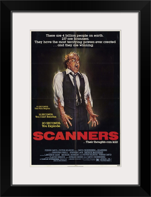 <p>Scanners are telepaths who can will people to explode. One scanner in particular harbors Hitlerian aspirations for his band of psychic gangsters. Gruesome but effective special effects.</p>
