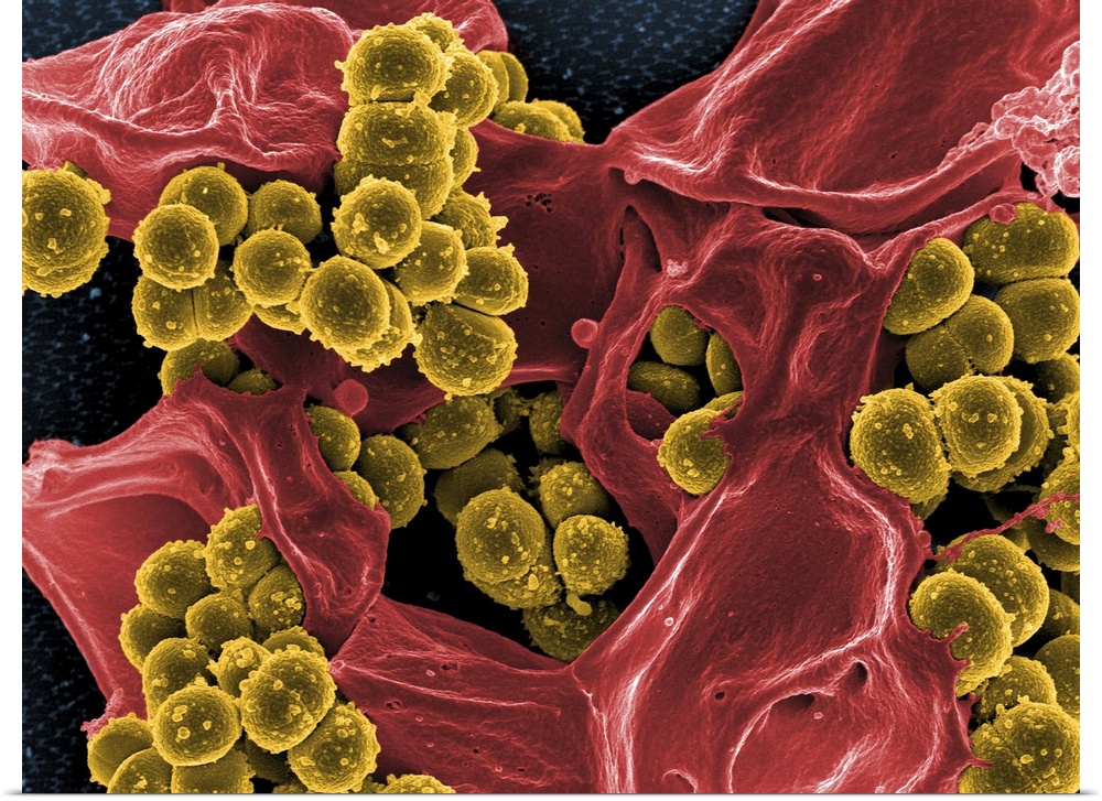 <p>Scanning electron micrograph of methicillin-resistant Staphylococcus aureus and a dead human neutrophil..</p>
