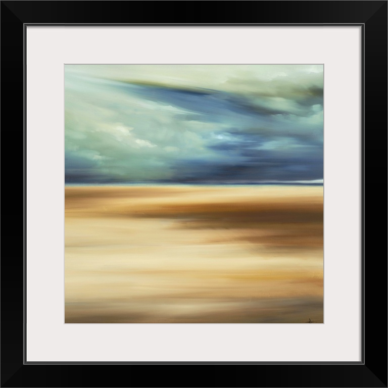 <p>Contemporary abstract painting depicting a sandy beach with the ocean in the distance under a cloudy sky.</p>