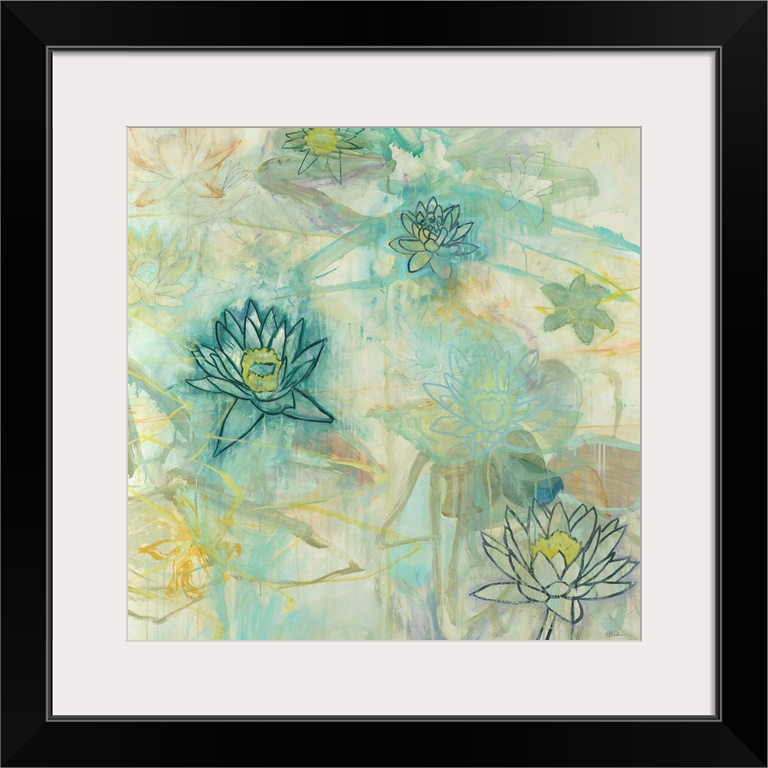 <p>Square painting with light abstract brushstrokes in the background and lotus flowers in the foreground in shades of blue, yellow, green, and cream.</p>