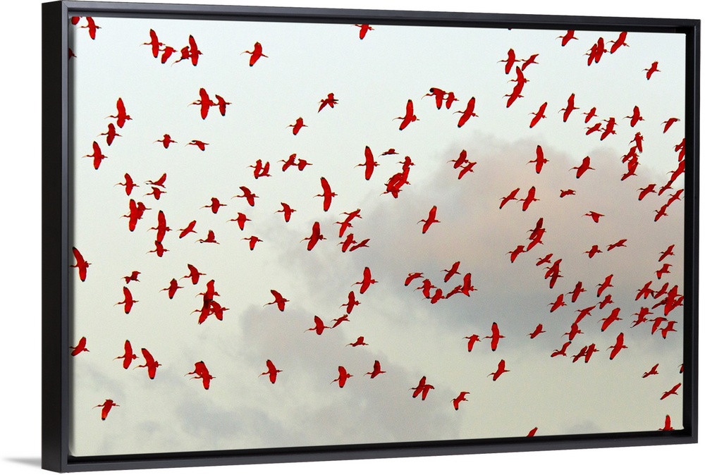<p>Scarlet ibis (Eudocimus ruber) flock in flight. These large waterbirds range from Central America and Northern South America and were introduced into Florida as part of a breeding program in 1962. Their name is derived from Greek meaning 'religious worship, sacred bird' and images of the them can be found in 4000 year old Egyptian wall paintings. Photographed over the Caroni Swamp, Trinidad.</p>