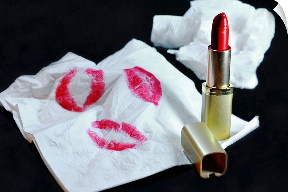 <p>Still Life of red lipstick and napkin with lipstick stains.</p>
