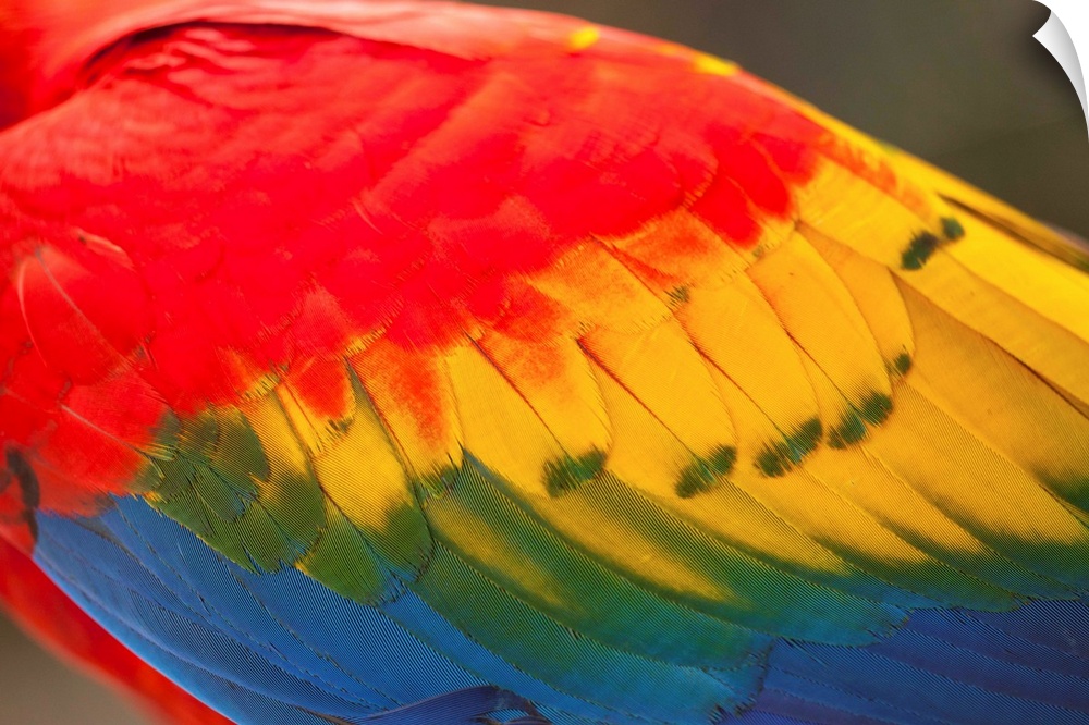 <p>Costa Rica, Guancaste Province, Canas, Close-up of feathers from Scarlet Macaw (Ara macao)</p>