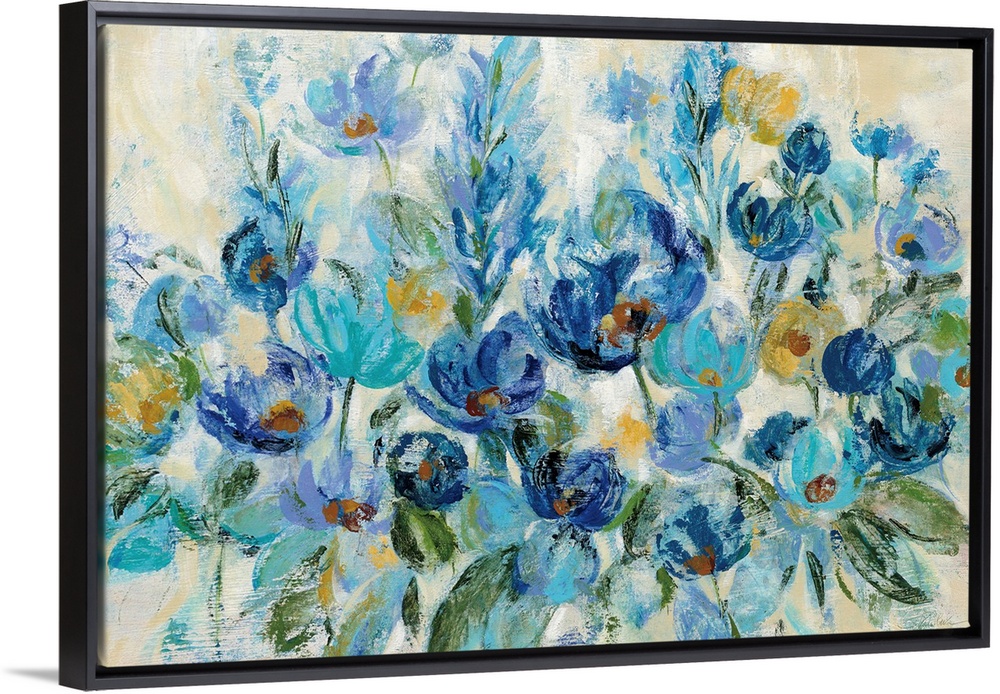 <p>Large painting of a bunch of flowers in shades of blue with some gold on a neutral colored background.</p>