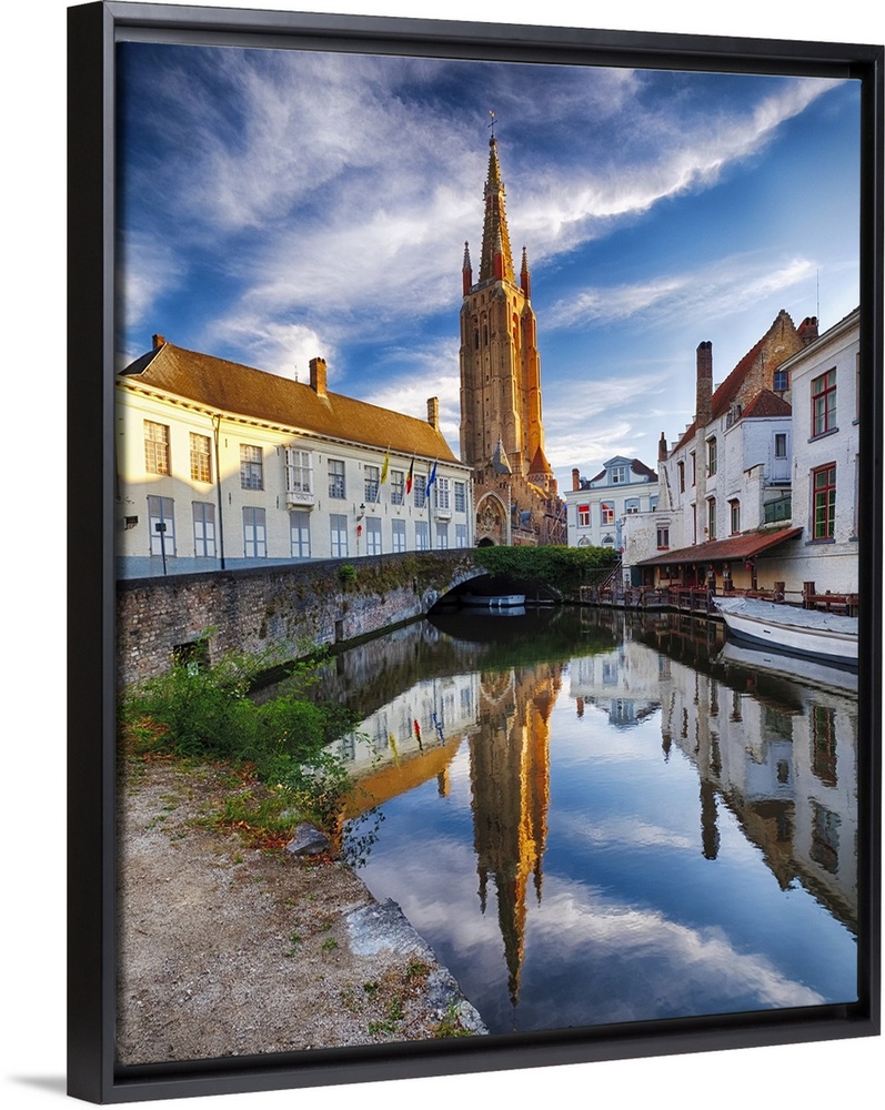 <p>Tranquil Scene in Bruges with the Church of Our Lady Reflected in the Canal, Bruges, Flanders, Belgium</p>