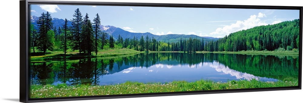 <p>The still waters of a Colorado lake reflect the trees and clouds in this panoramic landscape photograph.</p>
