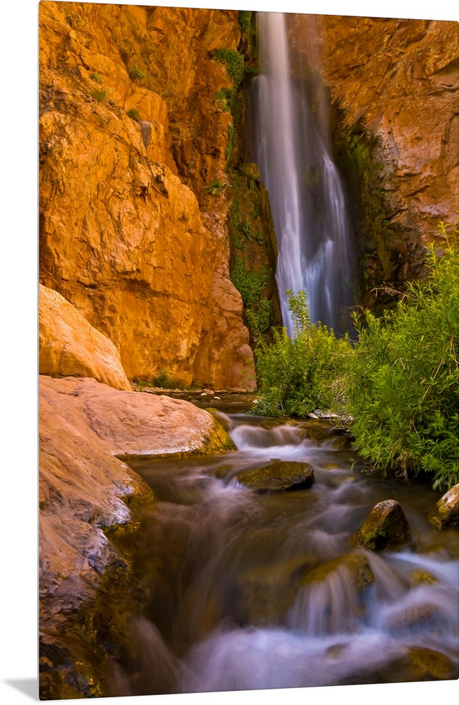 <p>This photograph is from the National Geographic Collection showing a waterfall cascading into a small boulder filled stream at the bottom of a canyon.</p>