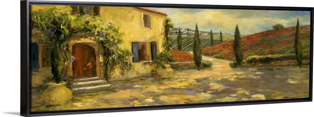 <p>A modern painting in a traditional style of a house and rolling hills in the Italy countryside.</p>