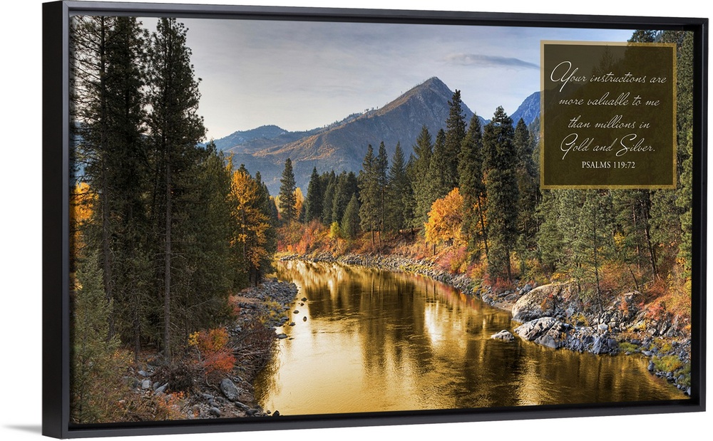 <p>Image Of A Scenic Landscape And Reflection Of Autumn Colours In A River With Scripture From Psalms 119:72</p>