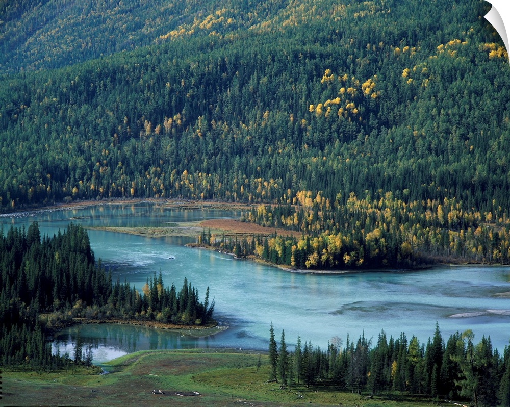 <p>Scenic mountain lake in autumn woodland, Xinjiang Uygur autonomous region, China, Asia.</p>