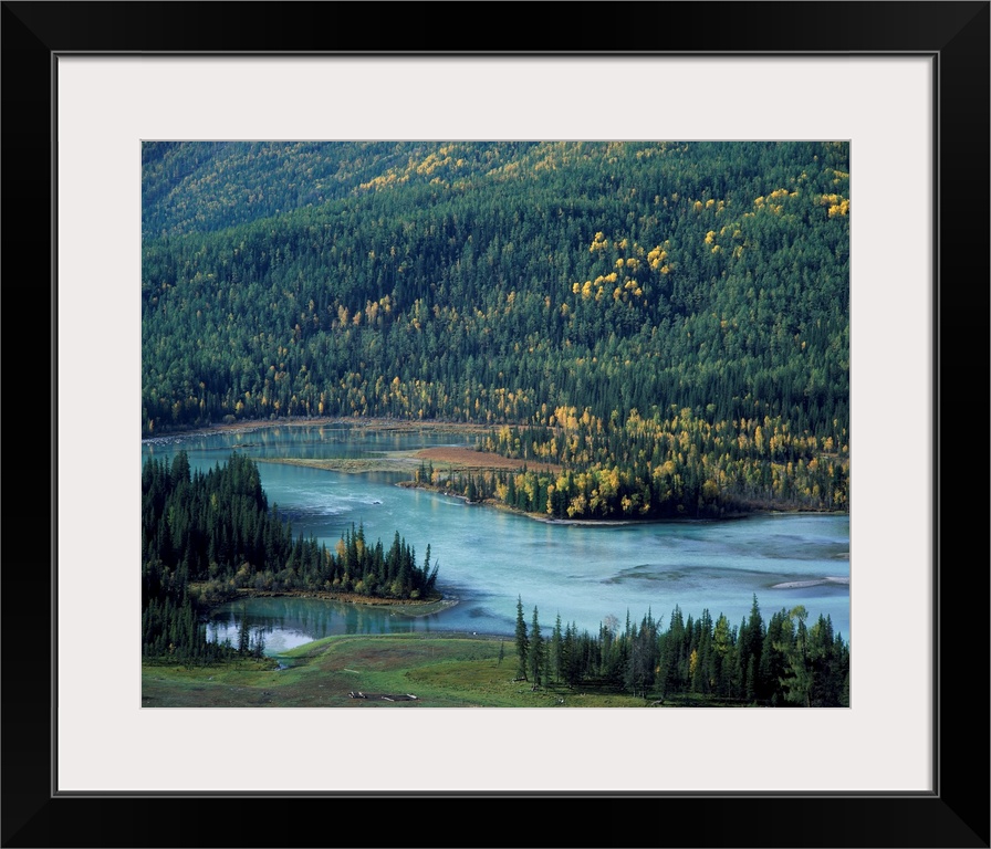 <p>Scenic mountain lake in autumn woodland, Xinjiang Uygur autonomous region, China, Asia.</p>
