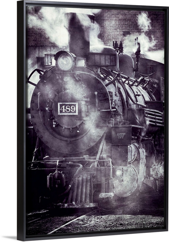 <p>Photograph of a vintage locomotive covered in steam on the train tracks.</p>