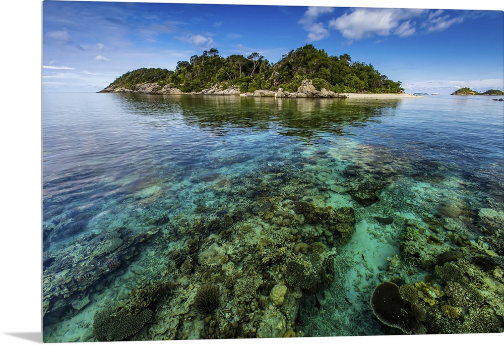 <p>Scenic seascape of coral surrounding a tropical island.</p>