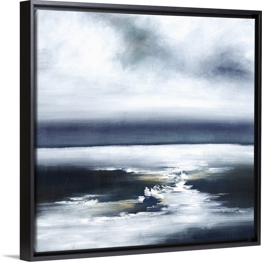<p>Contemporary painting of a calm seascape with blue tones.</p>