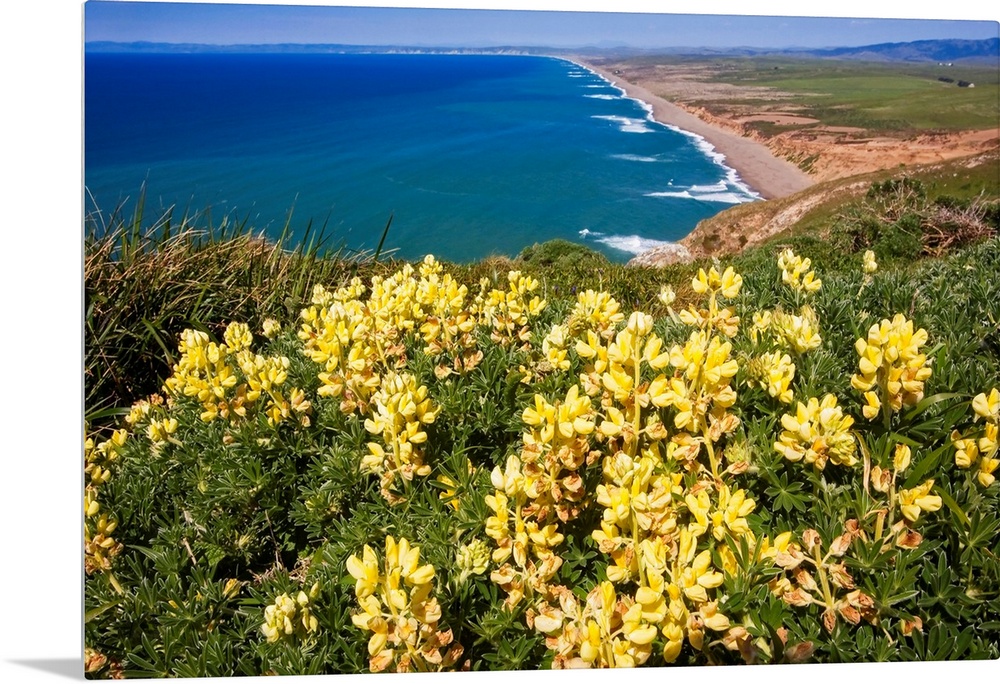 <p>Scenic view of a shoreline with Yellow Wildflowers, Point Reyes National Seashore, California</p>