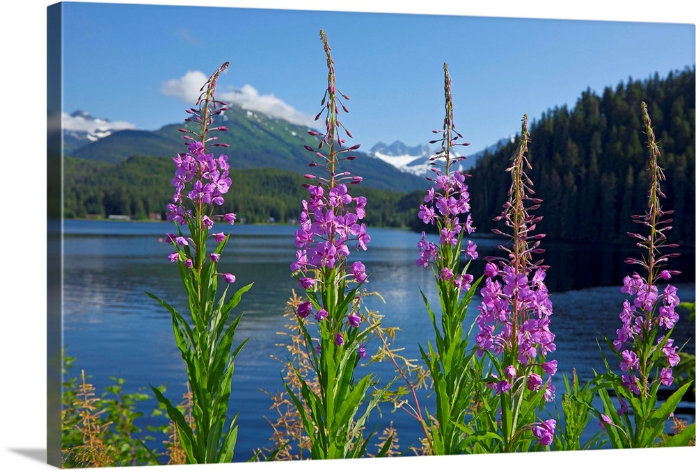 <p>Fireweed blooms along the shoreline of Auke Lake on a summer day, Auke Lake, Juneau, Alaska, Mendenhall Towers in the distance, Coast Range Mountains.</p>
