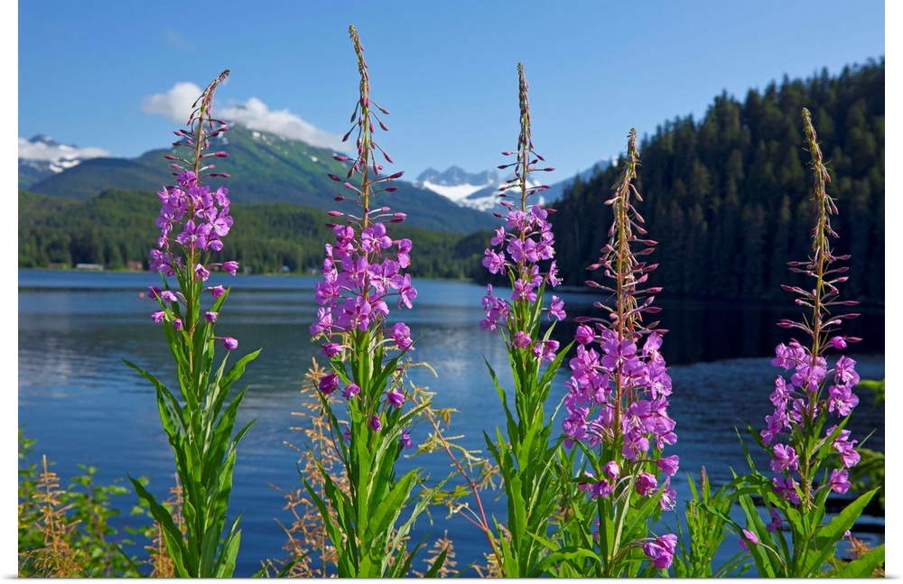 <p>Fireweed blooms along the shoreline of Auke Lake on a summer day, Auke Lake, Juneau, Alaska, Mendenhall Towers in the distance, Coast Range Mountains.</p>
